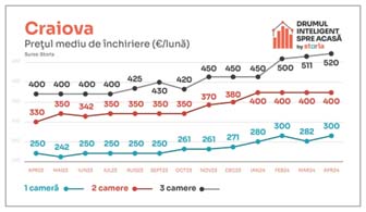 Astfel, în luna aprilie 2024, prețurile medii de închiriere au fost de 265 euro în cazul garsonierelor, de 400 de euro în cazul apartamentelor cu două camere și de 480 de euro în cazul apartamentelor cu trei camere.
