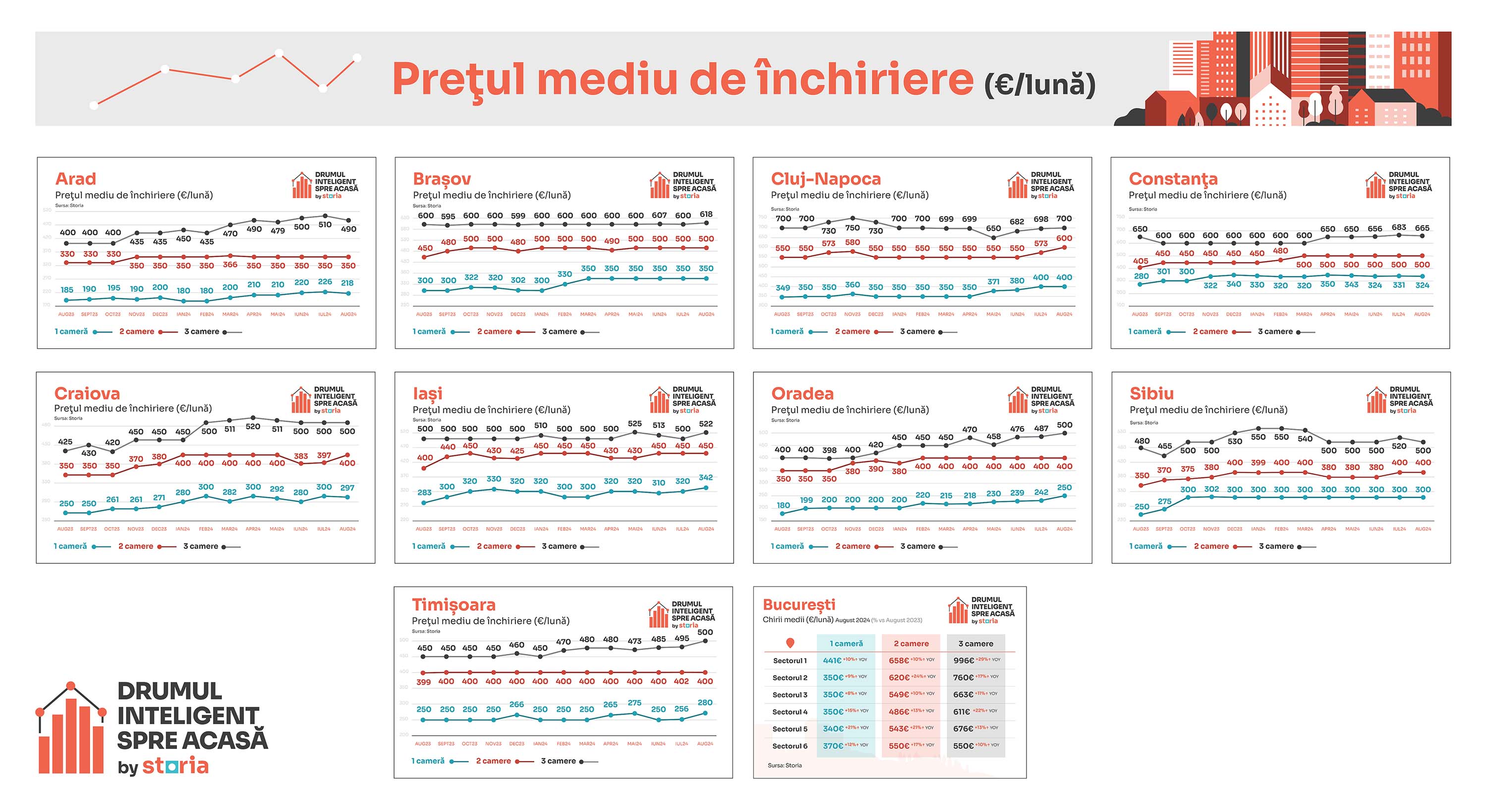 Cum au evoluat chiriile în alte orașe mari din țară în luna AUGUST, conform datelor Storia